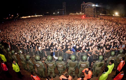 At some point, I don’t know who alerted them, but from the corner of my right eye I saw four Carabineros – the riot police – coming along the front of the stage from the right, with the helmets and the visors and the sticks…. One of them went past our security guys and as soon as these hundred wankers saw them, they ran.