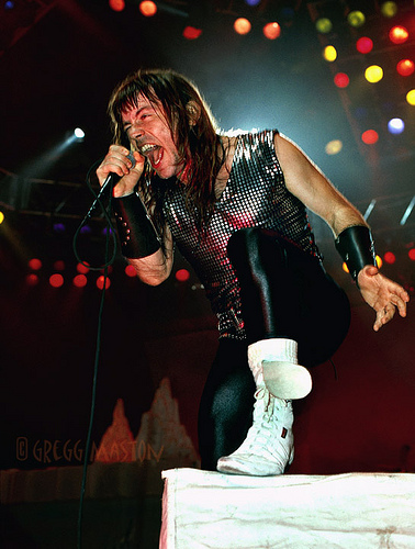 As for Bruce’s voice, it’s never been fully stable — and it’s not subtle, either. When hes on, he shakes the heavens but when he’s off, the Gods are cringing (and so’s everyone else). Though his performances on the World Slavery Tour were energetic, it’s painfully hard not to notice how horribly flat he was most of time. I actually heard great improvements in the Brave New World show and even as recently as just this past September in Austin where we were all astounded and enthralled when he hit and held the Number of the Beast intro scream. It was a beautiful thing…